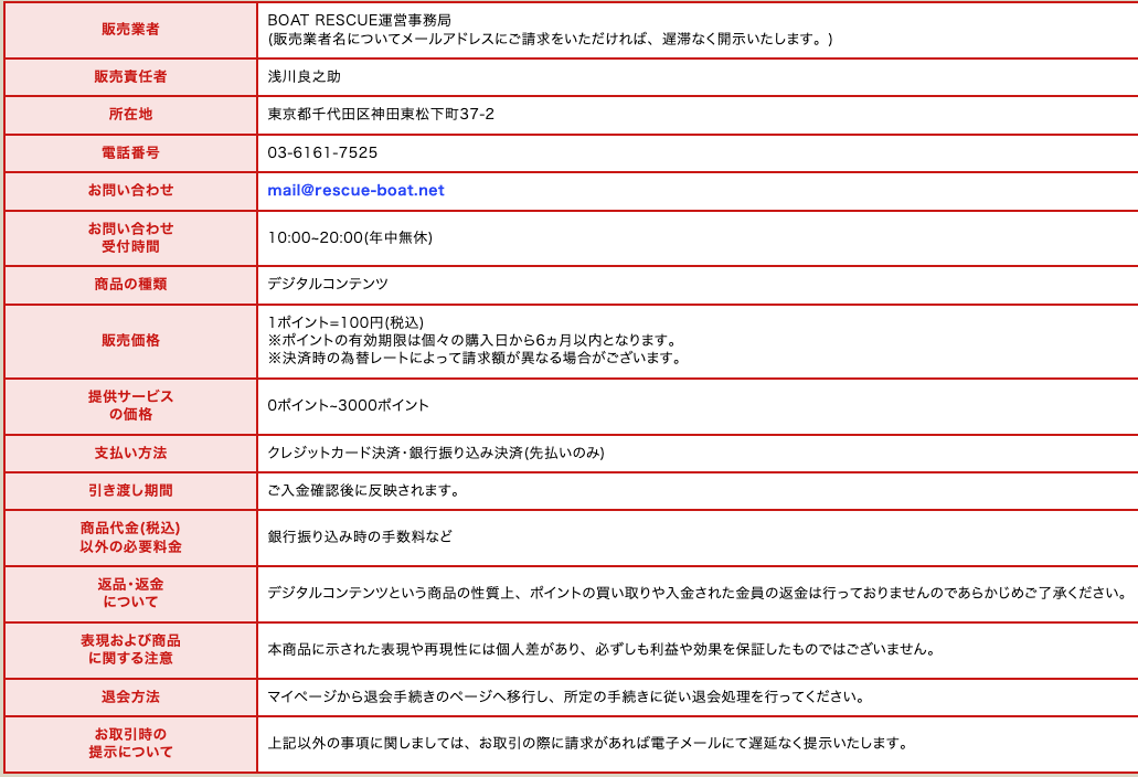 ボートレスキューは特商法表記をきちんと掲載しています。