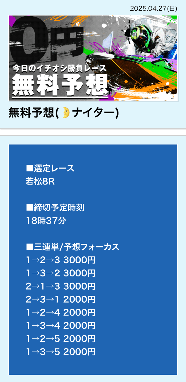 | 4月27日 | 若松8R | 三連単 | +30,800円 | 📸 |