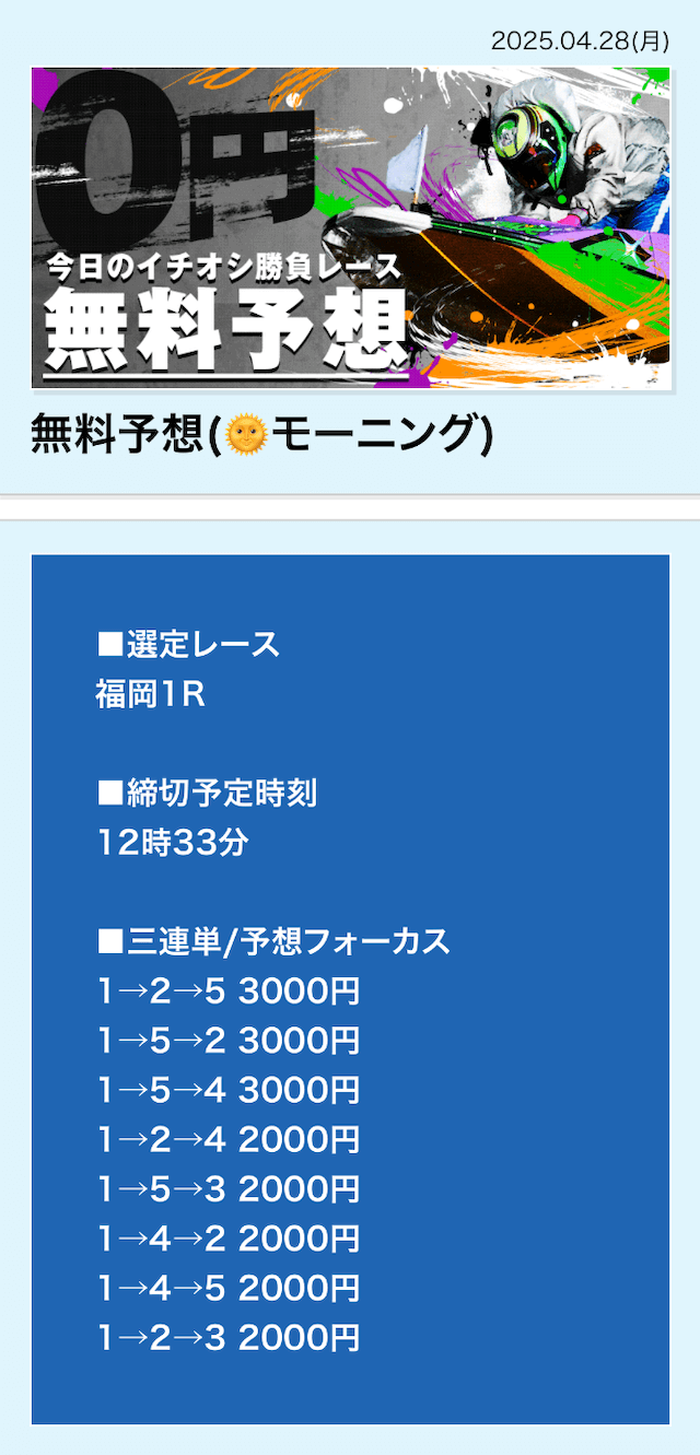 | 4月28日 | 福岡1R | 三連単 | 0円 | 📸 |