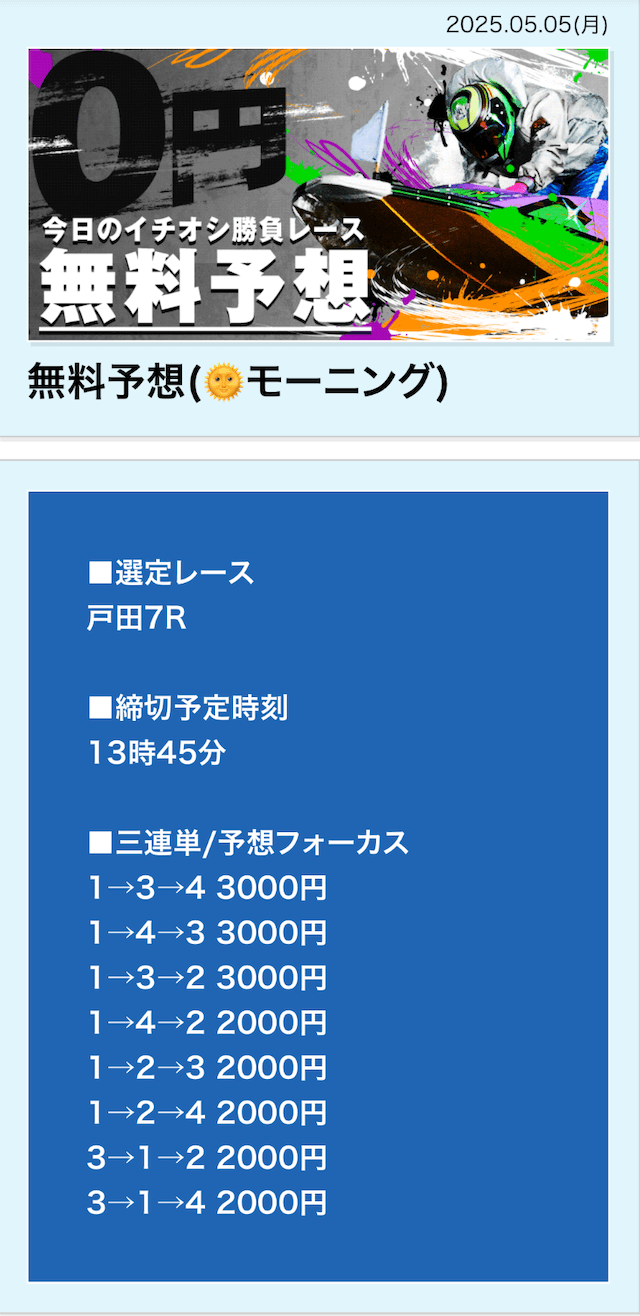 | 5月5日 | 戸田7R | 三連単 | 0円 | 📸 |