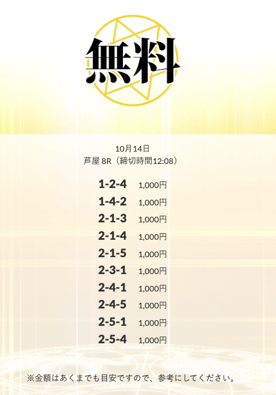| 10月14日 | 芦屋8R | 三連単 | +11,000円 | 📸 |