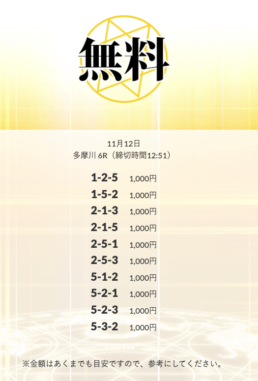 | 11月12日 | 多摩川6R | 三連単 | +9,500円 | 📸 |