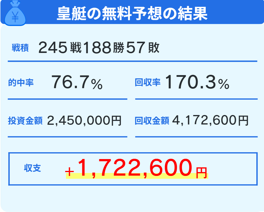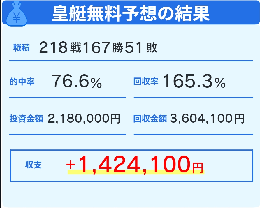 2年以上お世話になってる予想サイト。 的中率、回収率ともに皇艇がいちばん安定している気がする
