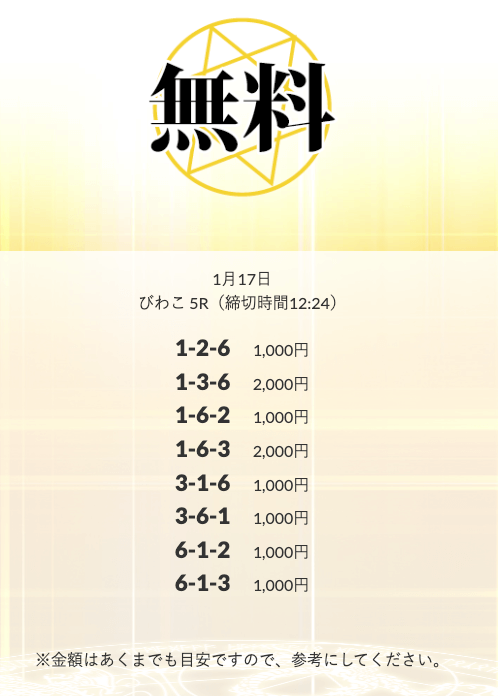 | 1月17日 | びわこ5R | 三連単 | 0円 | 📸 |
