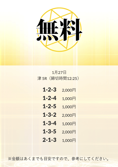 | 1月27日 | 津5R | 三連単 | 0円 | 📸 |