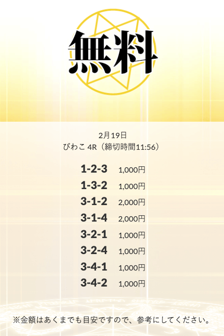 | 2月19日 | びわこ4R | 三連単 | 0円 | 📸 |