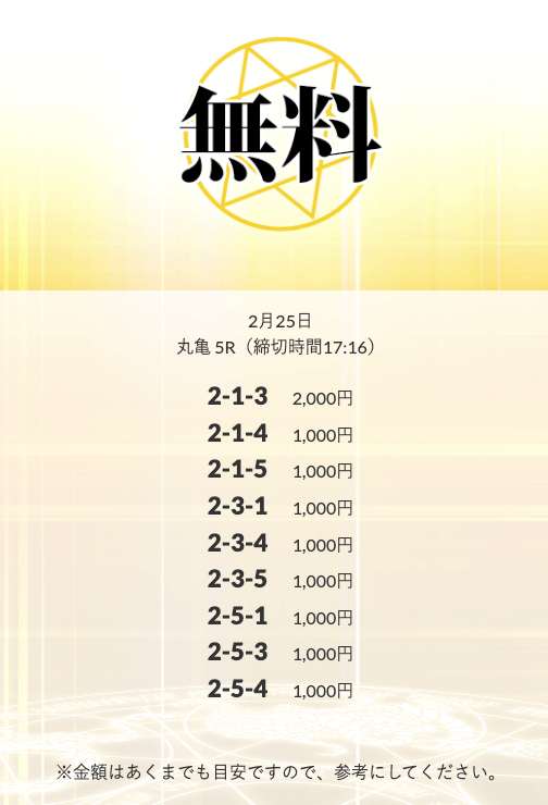 | 2月25日 | 丸亀5R | 三連単 | +23,400円 | 📸 |
