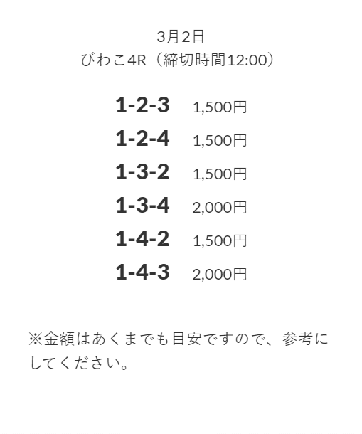 | 3月2日 | びわこ4R | 三連単 | +19,200円 | 📸 |