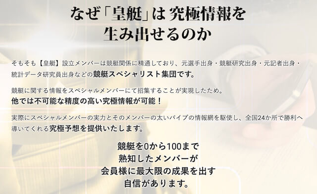 皇艇は、精度の高い情報提供を強みとしている競艇予想サイトのようです。