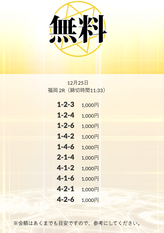 | 12/25 | 福岡2R | 3単 | 0円 | 📸 |