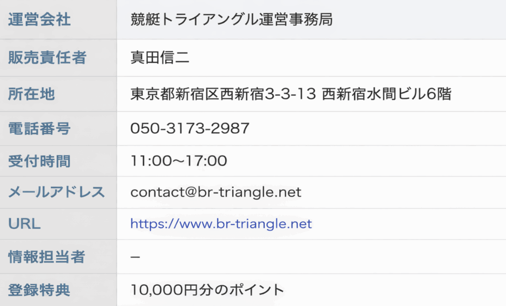 特商法表記が不十分な競艇予想サイトも少なくありませんが、競艇トライアングルは、特定商取引法に基づく表記を明確に掲載しています。