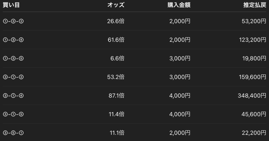一般的な8点買いよりも点数を抑えており、回収率を優先した賭け方でした。