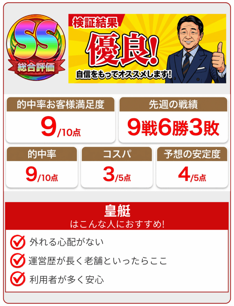 2年以上お世話になってる予想サイト。 的中率、回収率ともに皇艇がいちばん安定している気がする