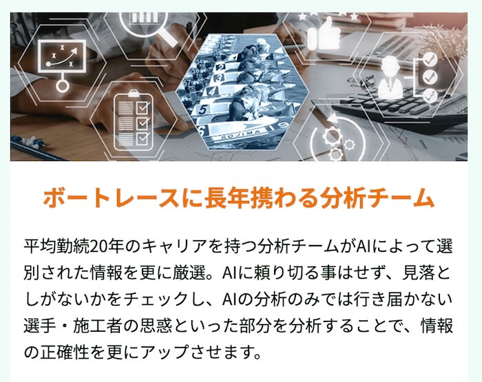予想のベースになっているのは徹底したデータ分析選手/モーターの成績や開催場の特徴など、細かなデータを分析し予想を組み立てています。競艇歴5年以上の予想師が関わっており、経験を活かした予想が提供されているのもポイントと記載されています。